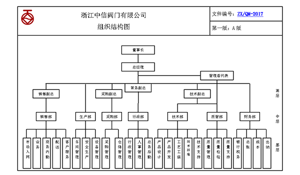 產品是過程的輸出或結果。產品的質量是由過程質量決定的,過程的質量是由系統的質量決定的。為確保系統、過程、產品的質量,公司依據質量管理體系標準要求,運用管理的系統方法、過程方法,識別了所需的過程及其接口關系,建立了公司的質量管理架構。公司質量管理體系組織機構圖: