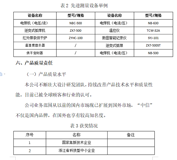 為保證所有產品在生產過程中都通過規定的檢驗后才能進入下一道工序,公司制定《檢驗和試驗控制程序》、《不合格品控制程序》開展嚴格的過程檢驗。質檢技術部負責制訂過程及最終檢驗和試驗規程,并負責組織過程檢驗工作;質檢員負責原材料、半成品、成品的檢驗。公司配備了檢測設備,見下表: